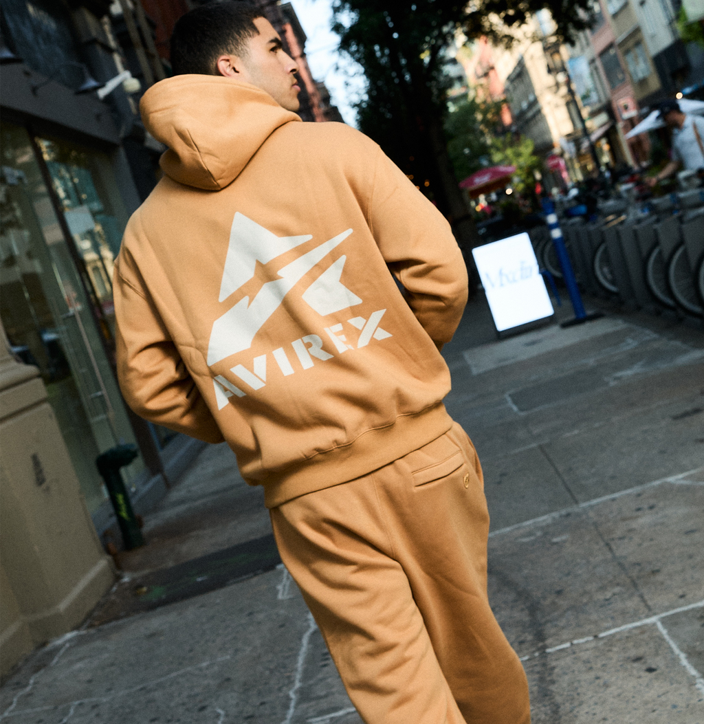 Cotton fleece jogger with Avirex stacked logo at leg and logo patch at back pocket.