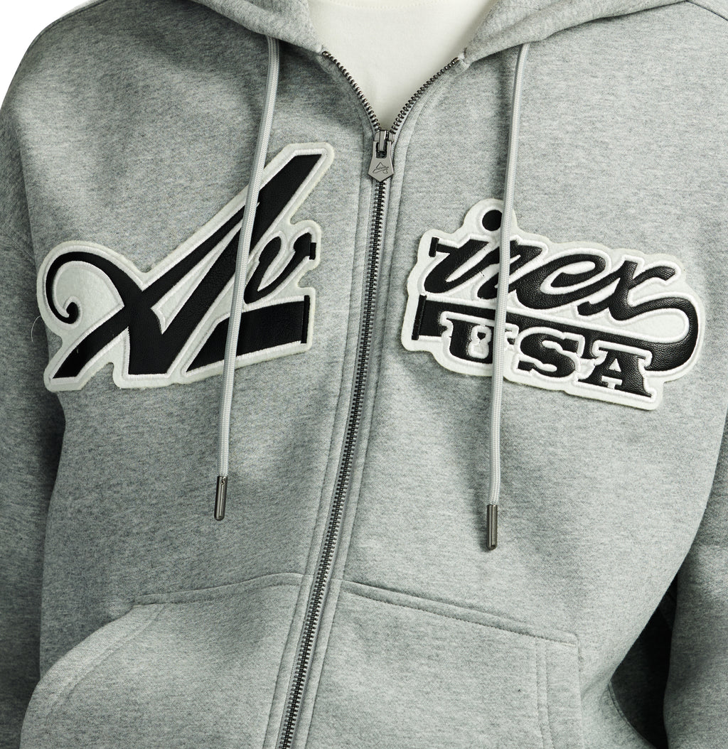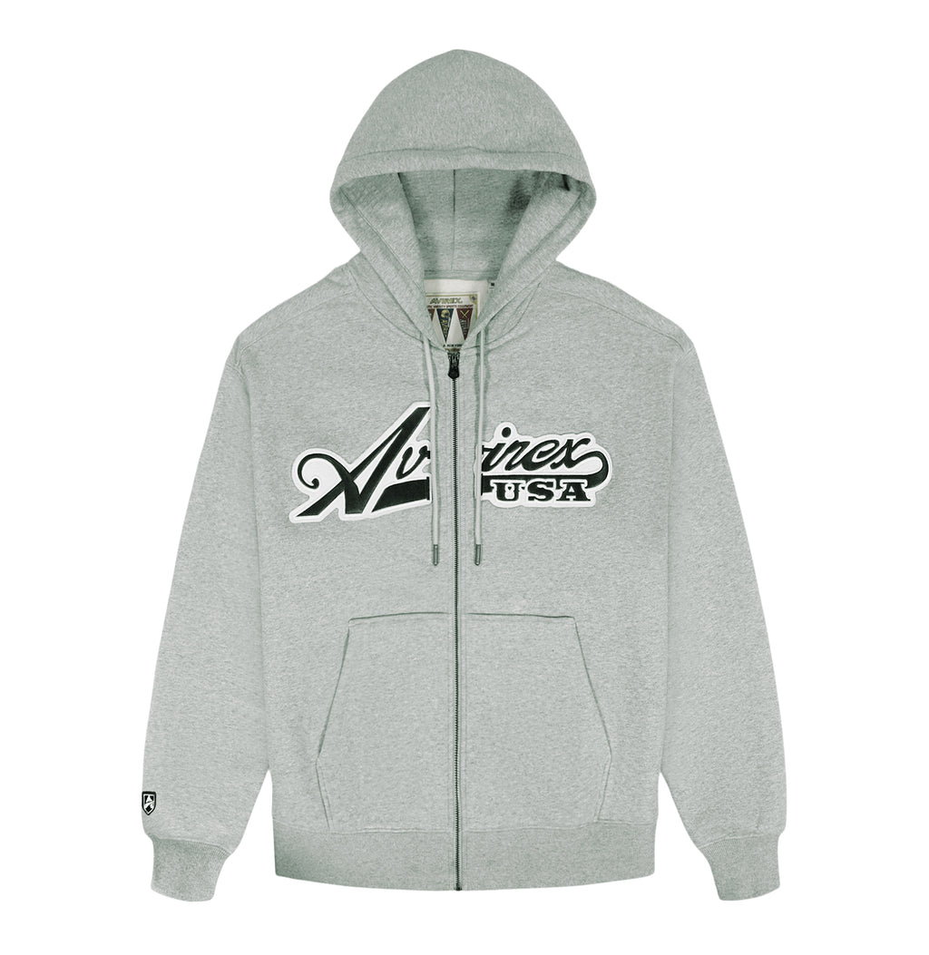 Avirex full-zip cotton fleece hoodie. Features embroidered script lettering across the front and "A" crest patch at cuff.