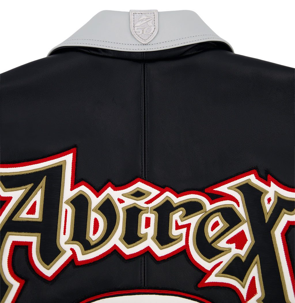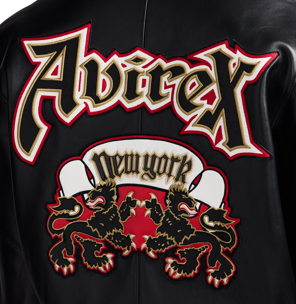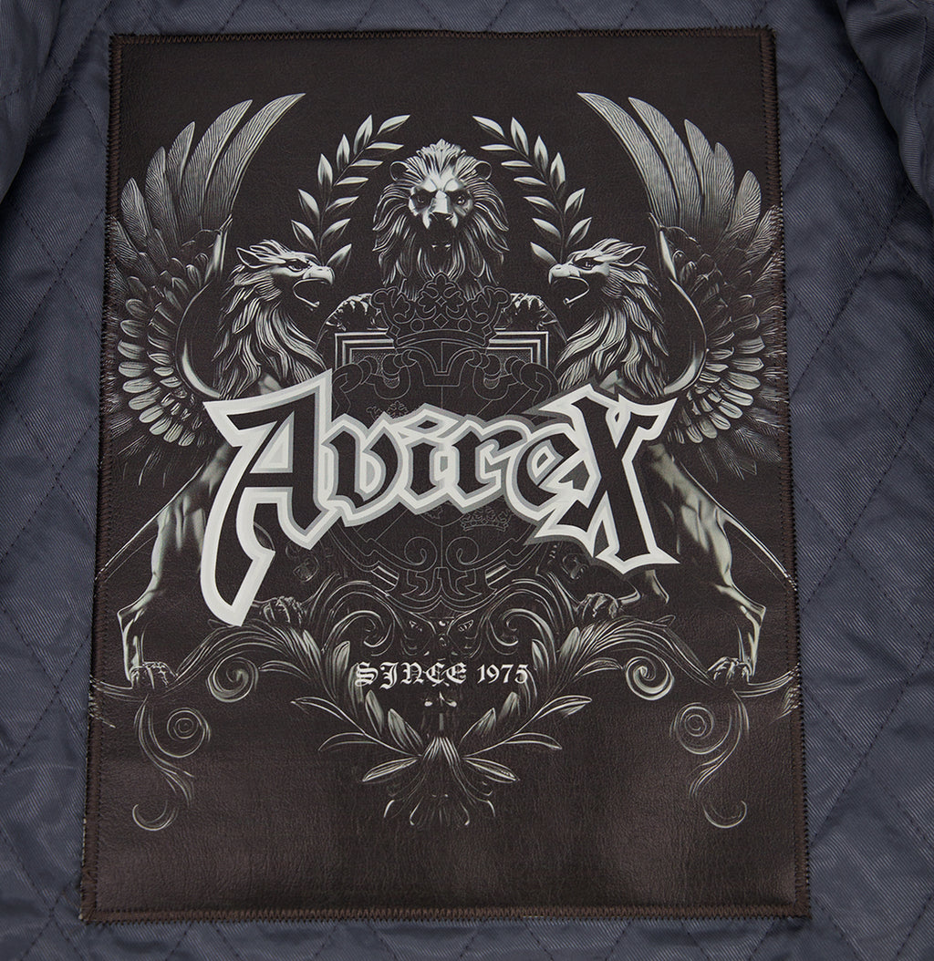 Avirex two-tone goth leather jacket. Features griffin art patch set with patent detail at sleeves and back.