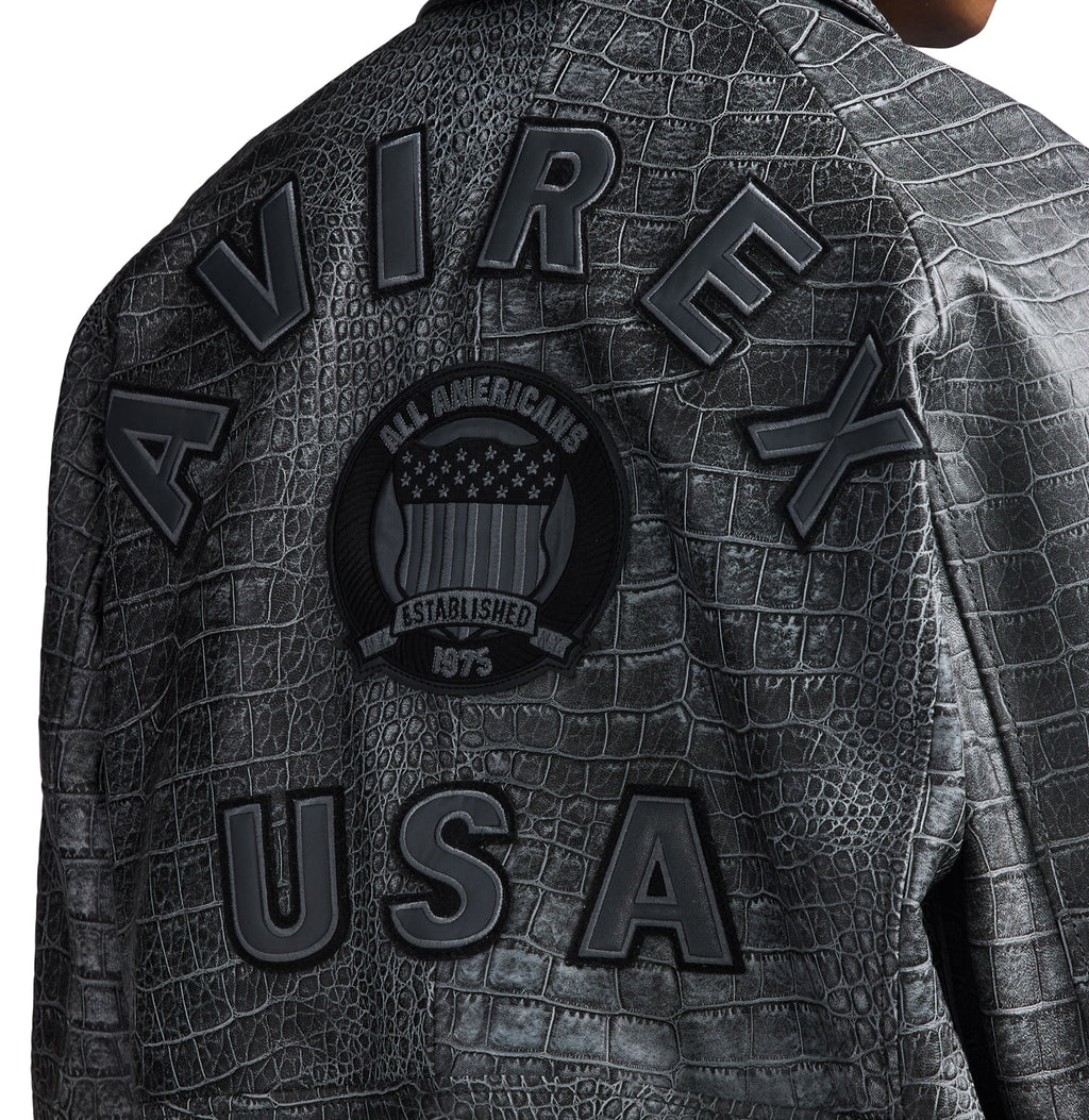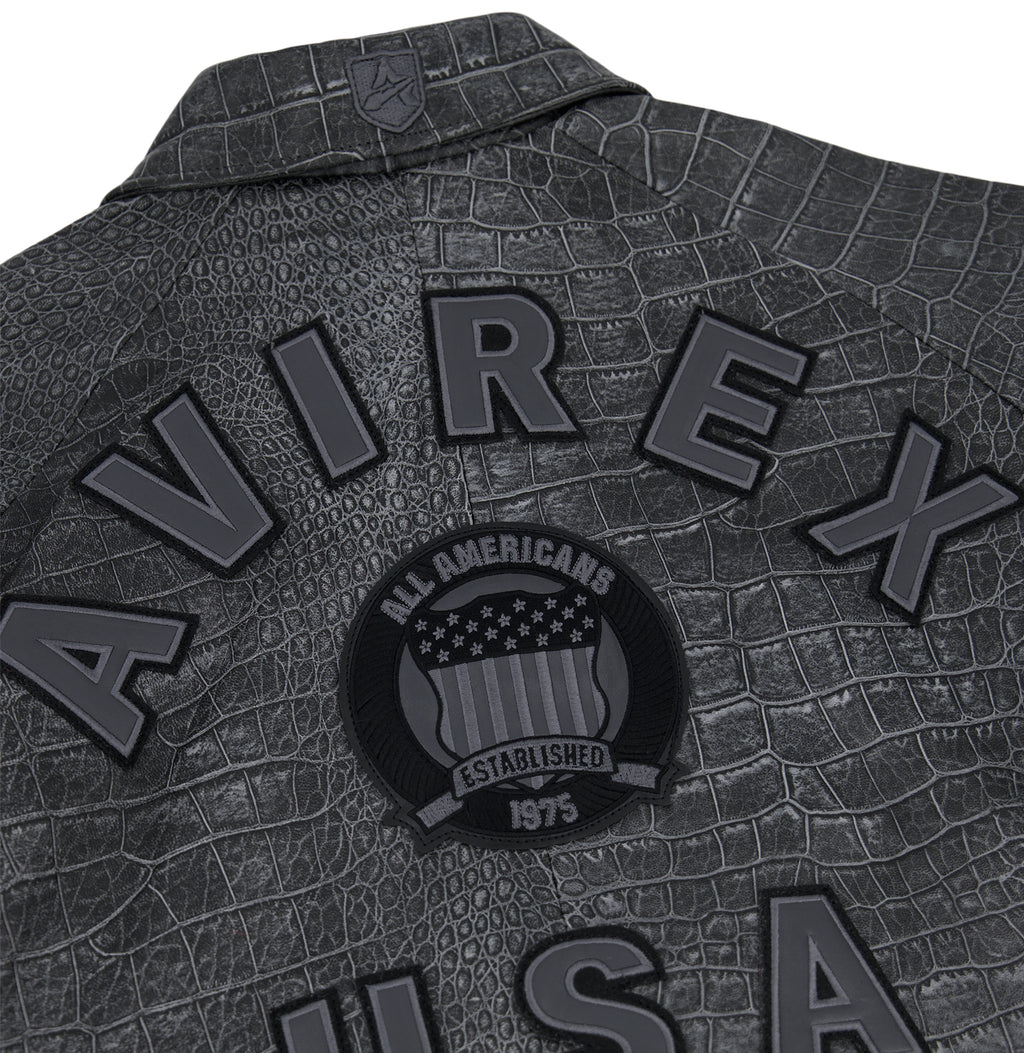 Avirex military bomber jacket is designed in 100% antique European lamb leather. Features distressed croc exterior.