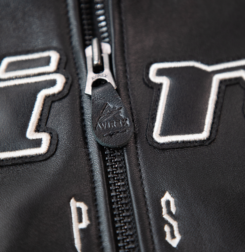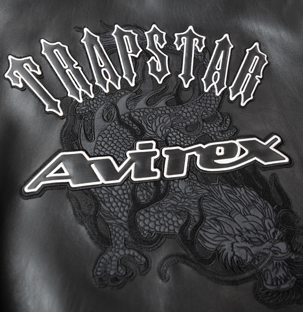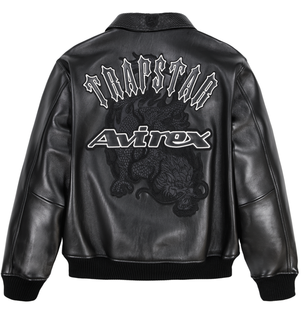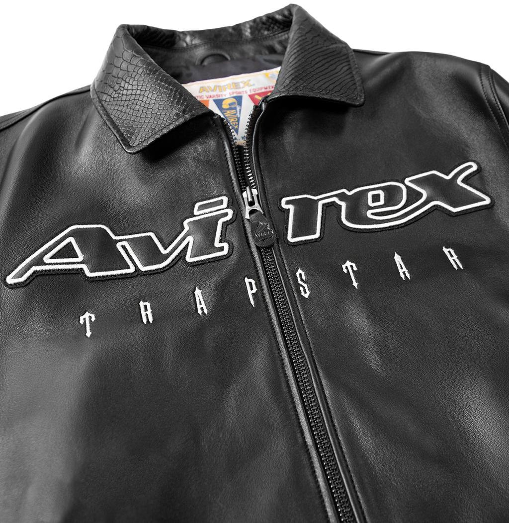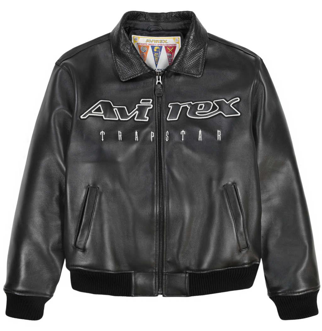 Avirex and Trapstar collaborated to release a limited edition collection that blends Avirex's iconic leather craftsmanship with Trapstar's streetwear aesthetics. Avirex collab jacket with Trapstar features a snakeskin embossed collar and collaboration art set at back. Designed in 100% antique European lamb leather.