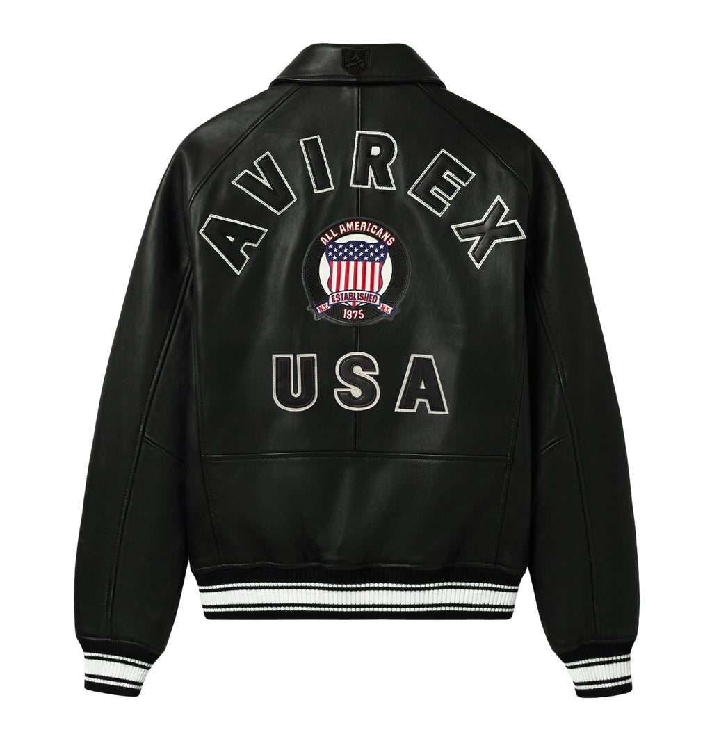 More than 40 years in the making, this original and iconic Avirex military bomber jacket is designed in 100% French lamb leather.